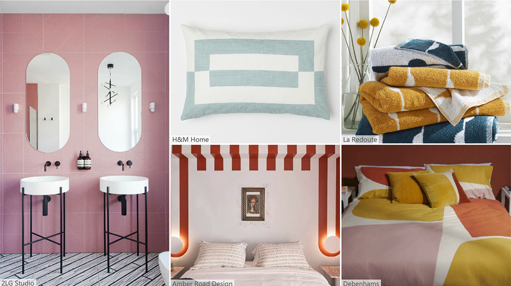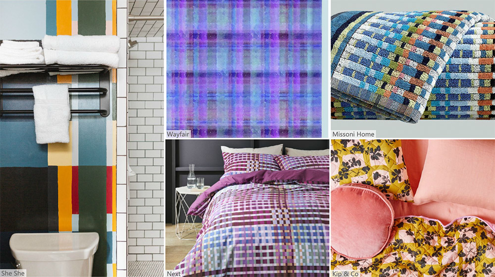 叛逆的風格以朋克風的格子圖案出現在臥室和浴室。呈現一系列色彩的編織物創造出不規則的格子圖案,這將空間增添俏皮感和堅韌風格。利用分層的飽和色彩拼接,并重構條紋。窄條紋交織在一起,形成精致的幾何圖案。