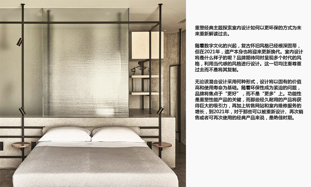 重塑經典在圖形、色彩、印花以及紡織品中將混合設計與過去時代中的建筑參考物相結合。這一切都是關乎對極繁主義風格的美感進行平衡,配以緊密聯系且精致的調色板,從而產生一種具有親切感和前瞻性的美感。