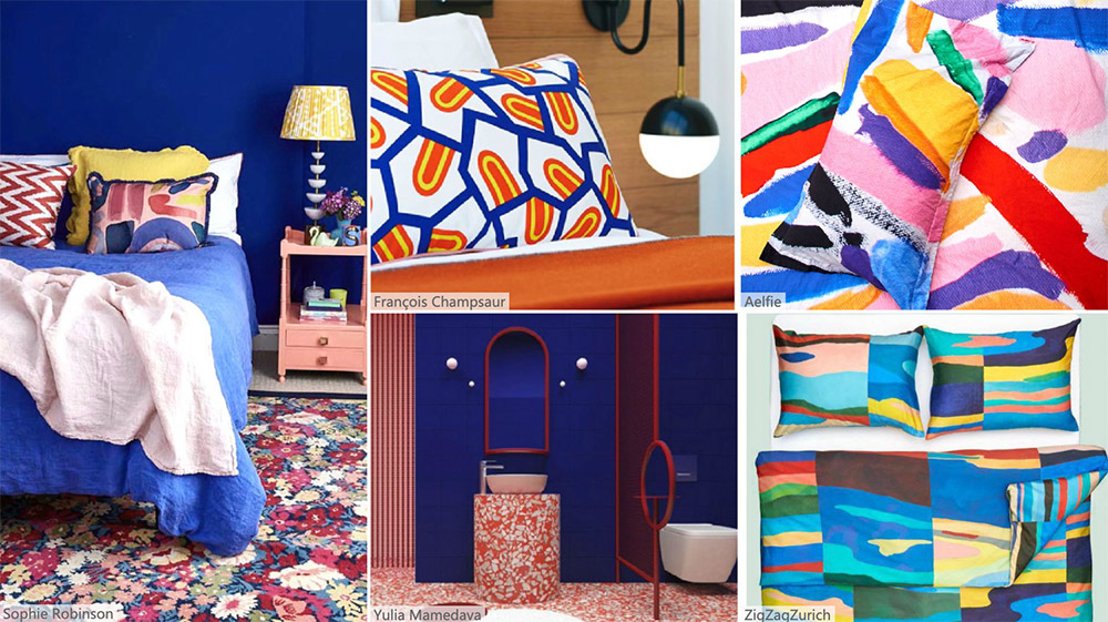采用具有藝術氣息的設計方式,呈現出令人愉悅以及色彩繽紛的產品。大膽地大量使用飽和色彩,白色背景色可對臥室的紡織品進行提升。印花和圖案為不規則且不對稱的,將動感鈷藍用于設計中。