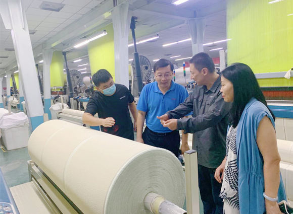 ▲相關(guān)負(fù)責(zé)人帶領(lǐng)兩位老師了解織造環(huán)節(jié)