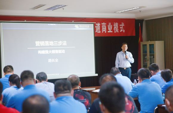 次日,路老師給國內(nèi)市場品牌營銷團(tuán)隊(duì)及相關(guān)部門核心業(yè)務(wù)骨干親自授課,舉辦了一場以“強(qiáng)大品牌、強(qiáng)大市場、強(qiáng)大渠道商業(yè)模式”為主題的營銷落地培訓(xùn)會(huì)。路老師從強(qiáng)大產(chǎn)品、強(qiáng)大市場、強(qiáng)大執(zhí)行三個(gè)層面,結(jié)合其多年服務(wù)客戶的成功實(shí)戰(zhàn)經(jīng)驗(yàn),為我們深入淺出的剖析營銷落地三步法,其所授課程都是大咖干貨,為解決公司內(nèi)部認(rèn)知,統(tǒng)一思想夯實(shí)了基礎(chǔ)。
